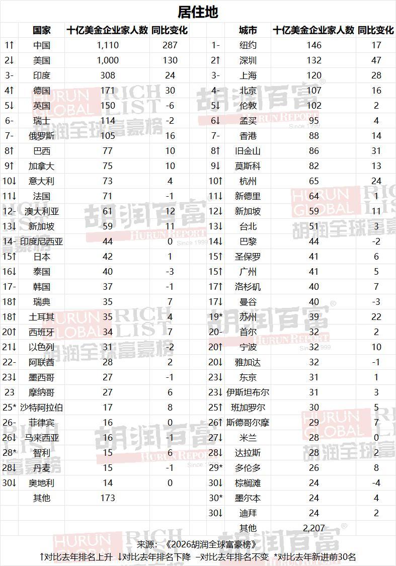 榜单显示,全球十亿美金企业家数量首次突破4000人大关,达到4020位,较去年新增578位,创历史纪录。过去一年,日均诞生两位十亿美金企业家;中国以1110位十亿美金企业家重回全球第一,较去年增加287位;美国以1000位位居第二,新增130位。本次榜单新晋726位企业家。其中,318位来自中国,占比超四成。