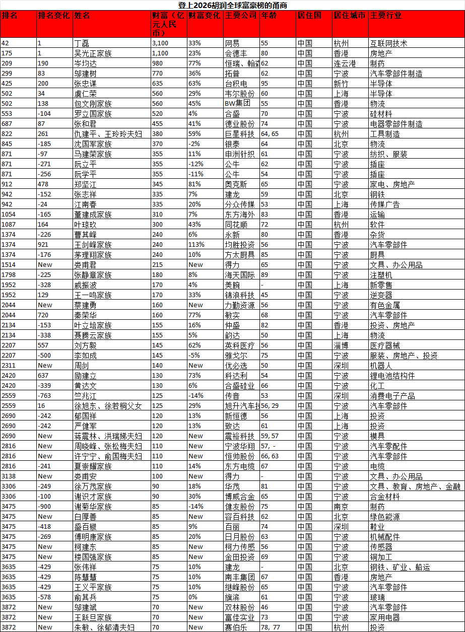 财富规模上,网易丁磊以3100亿元财富成为上榜甬商中的榜首,位列全球第42位。本土企业家中,拓普集团董事长邬建树表现最为亮眼,受公司市值增长带动,其财富同比增长36%,榜单排名上升83位,成功跻身全球前300名。力勤资源蔡建勇、震裕科技蒋震林夫妇等13位甬商新晋上榜,成为甬商创富新力量。