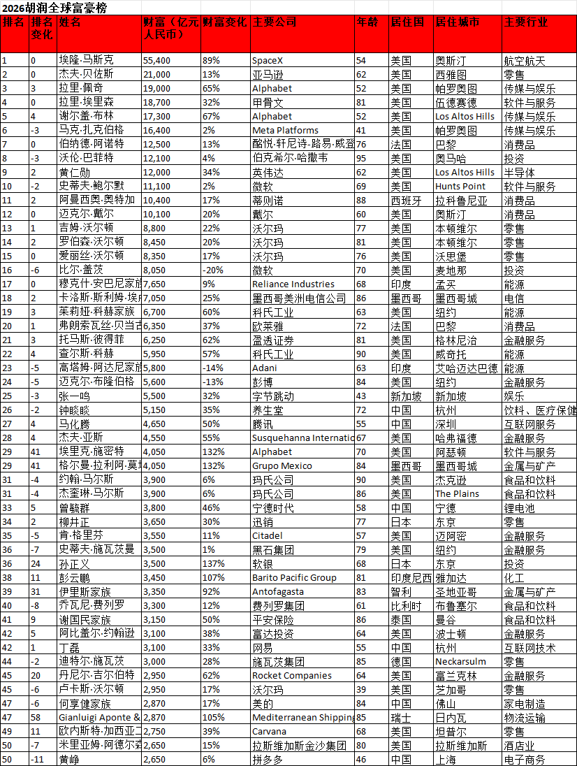 3月5日,胡润研究院发布《2026胡润全球富豪榜》,榜单财富计算截至2026年1月15日。这也是胡润研究院连续第15年发布全球富豪榜单。